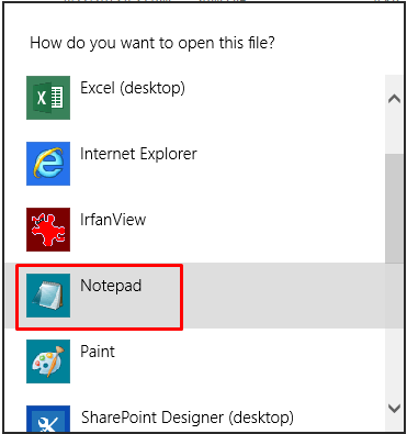 - Select Notepad from the choice of programs displayed for you. If you do not see Notepad in the list, scroll down to the bottom of the screen and click the hyperlink Look for another app on this PC.