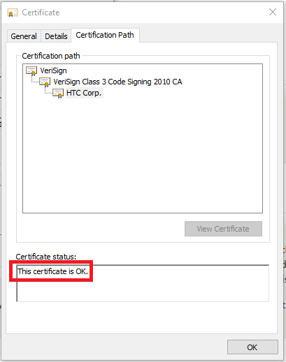 - If you click the Certificate Path tab on the Certificate screen shown in the previous step, you will notice that the certificate status is OK for all three certificates in the certificate chain (VeriSign, VeriSign Class 3 Code Signing 2010 CA, and HTC Corp.).