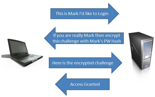 4. Server: You are allowed access. (The server only allows access if it was able to successfully decrypt the encrypted challenge with the user’s password hash, otherwise access is denied.)