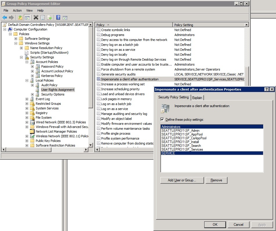 You may encounter a problem when you try to give the service accounts permission to impersonate a client after authentication. On your WS08 Domain Controller you can start Group Policy Management Console, go to Group Policy Objects, right-click Default Domain Controllers Policy and select Edit. In the Group Policy Management Editor, go to Computer Configuration, Policies, Windows Settings, Security Settings, Local Policies, User Rights Assignment and double-click Impersonate a client after authentication. Check the box Define these policy settings. If you simply add the service accounts you created and then click Apply or OK you won’t get anywhere. Notice that the warning at the bottom is telling you that you need to add the Administrators and the SERVICE account.