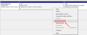 When you are in the Disk Management you may notice that when you right-click Partition C the option to extend the partition is grayed out.